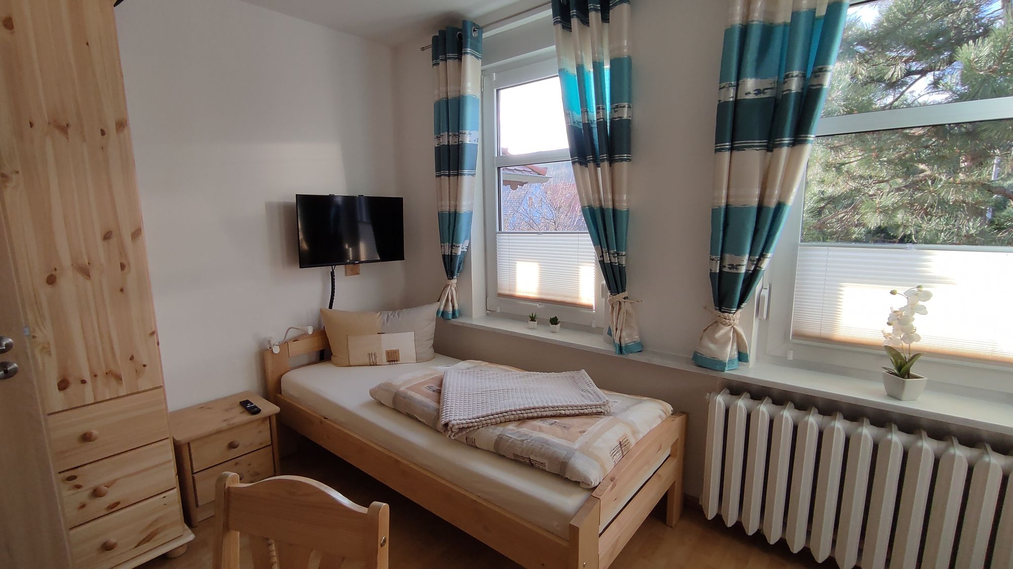 Schlafzimmer 2 mit zwei Einzelbetten (90 x 200), Kleiderschrank und TV digital