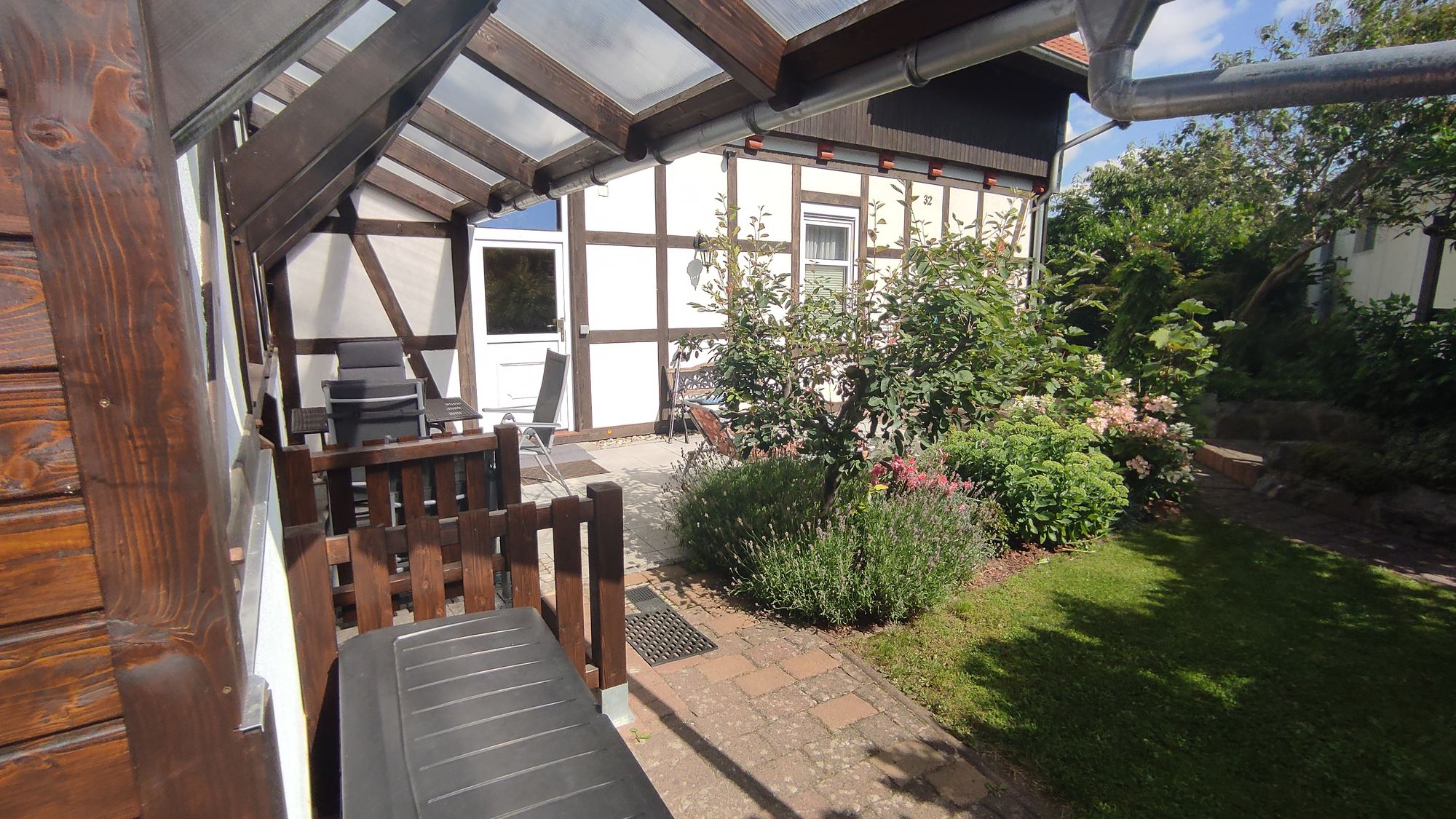 Außenbereich mit Terrasse hinter dem Haus in ruhiger Lage mit Gartenmöbeln, Sonnenschutz, Grillplatz, Windschutz, Schaukel für die Kleineren, Liegewiese und Sonnenliegen