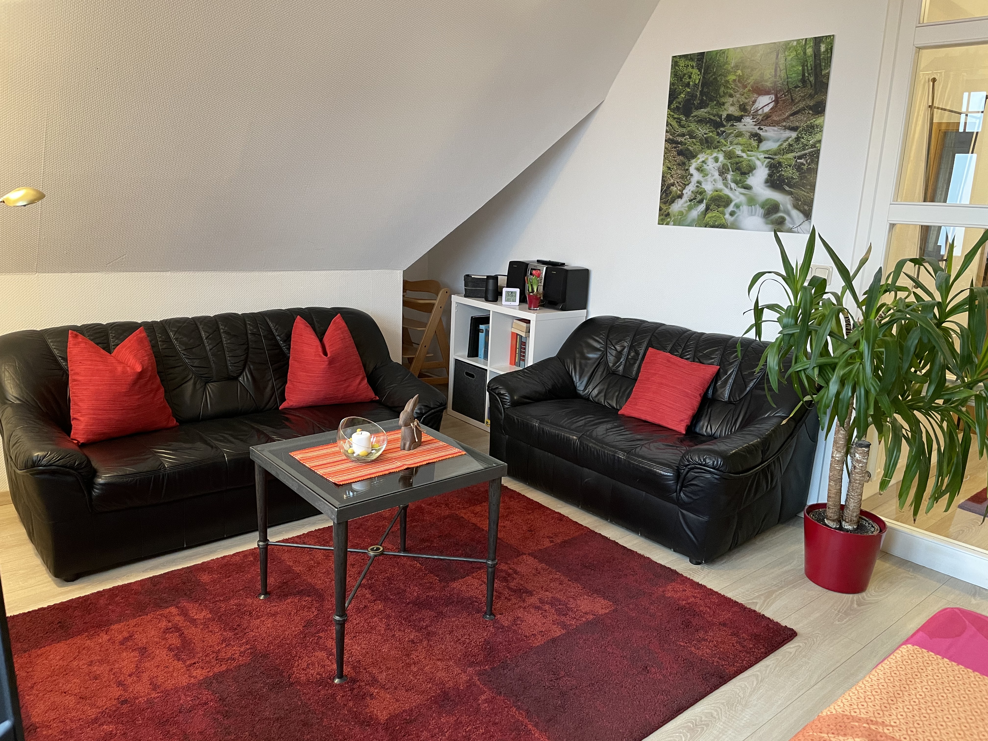 Die Komfort-Ferienwohnung 1 ist empfehlenswert für 3 Erwachsene oder für 2 Erwachsene und 2 Kinder. Die Ferienwohnung ist gemütlich und wohnlich eingerichtet. Im Wohnzimmer steht eine Ledersitzgruppe und am Fenster eine Esstisch für 4 Personen. Das Wohnzimmer ist mit pflegeleichtem Laminatboden ausgelegt.