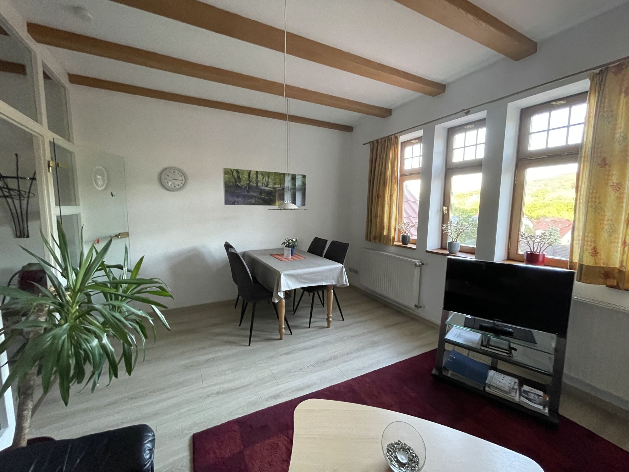 Wohnzimmer mit Sitzecke und Esstisch für 4 Personen