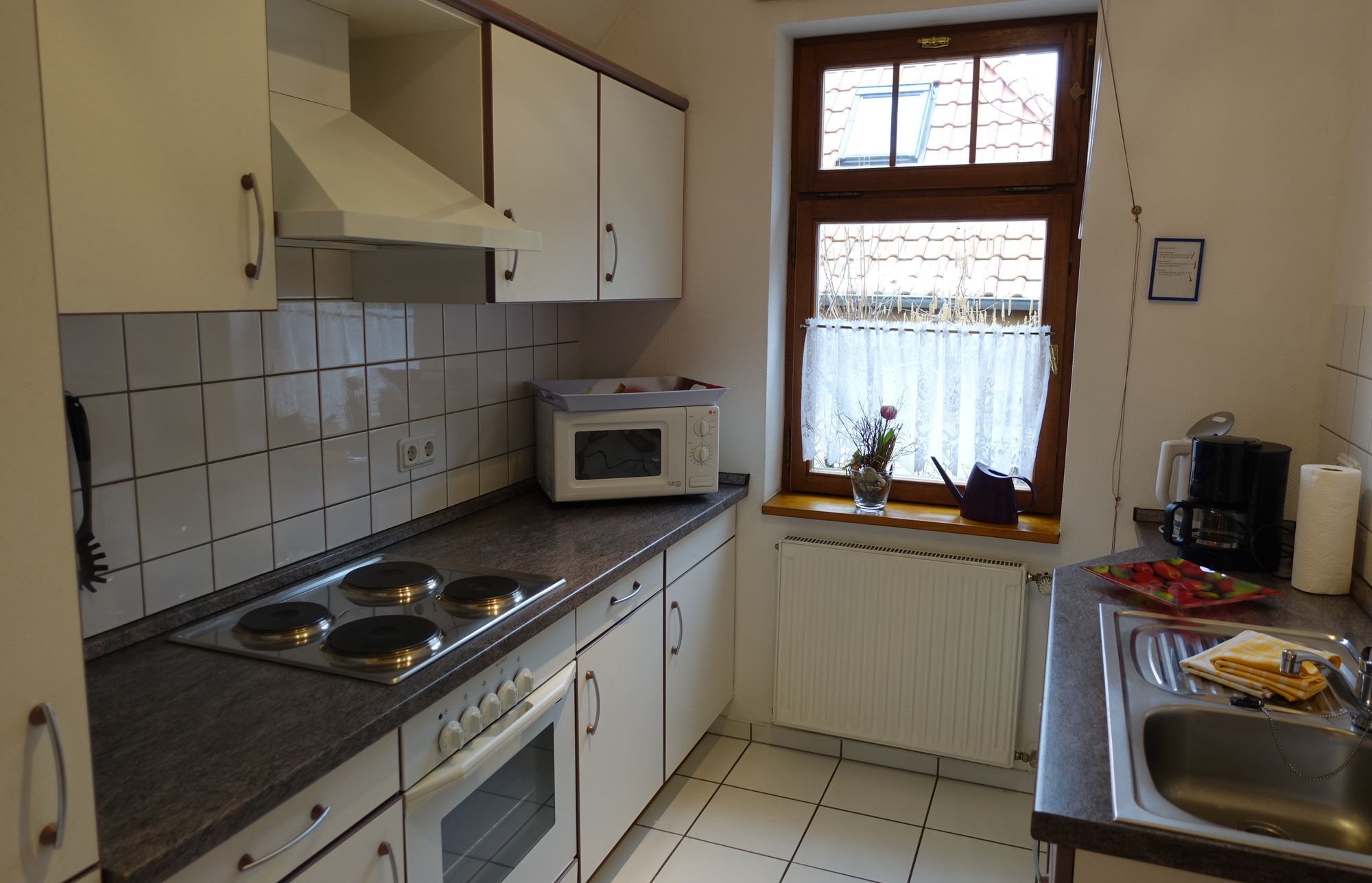 Die helle, praktische Küche der Ferienwohnung 1 ist voll ausgestattet mit einer Einbauzeile, einer Mikrowelle, einer Kühl-Gefrierkombination, einem Geschirrspüler sowie einem 4-Platten-Herd.