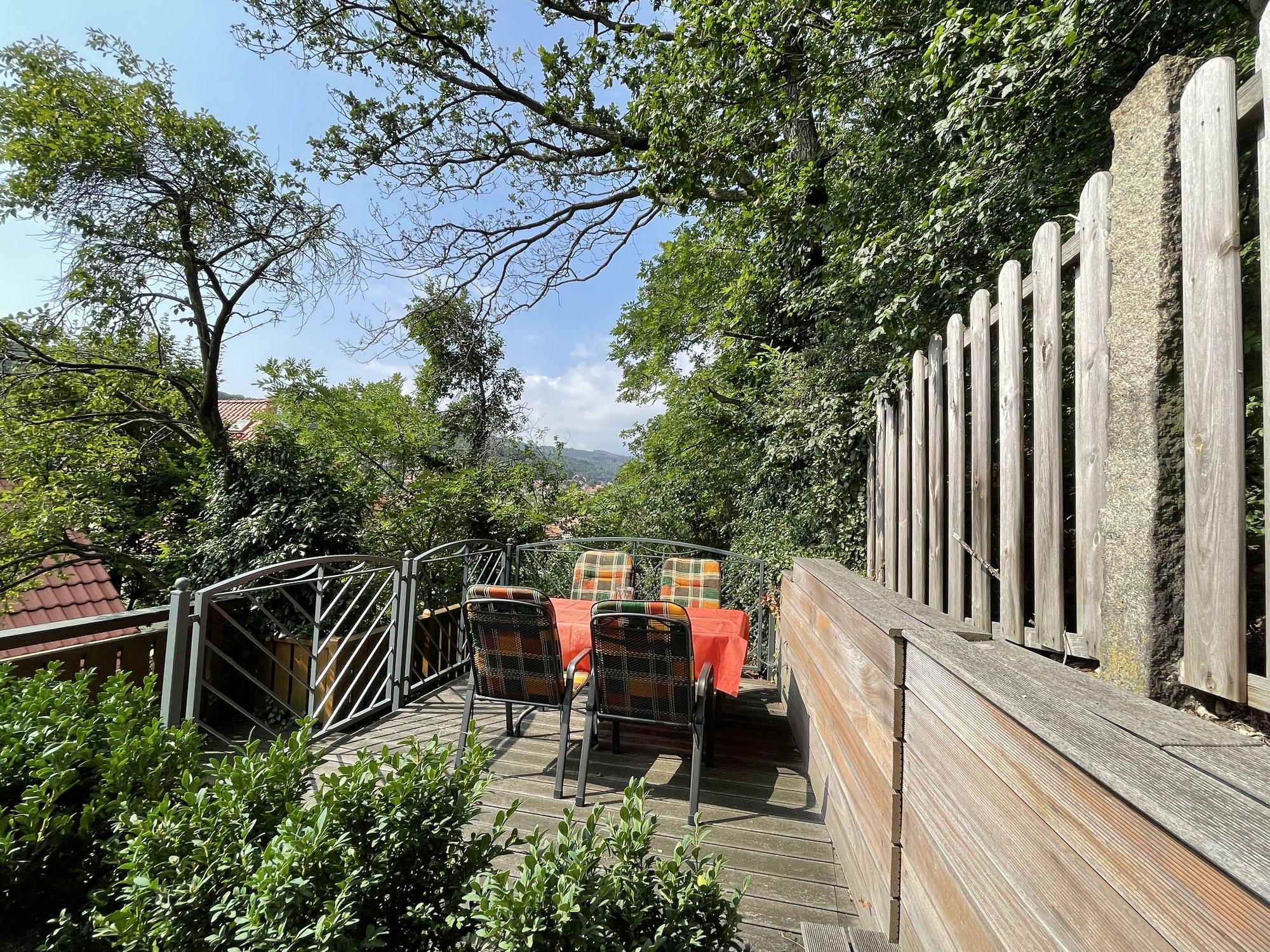 Die großzügige Außenterrasse der Ferienwohnung 1 können Sie über einige Stufen hinter dem Haus erreichen. Durch die ruhige Hanglage des Gästehauses Brandelik am Waldrand können Sie bei einem gemütlichen Grillabend den einzigartigen Ausblick genießen.