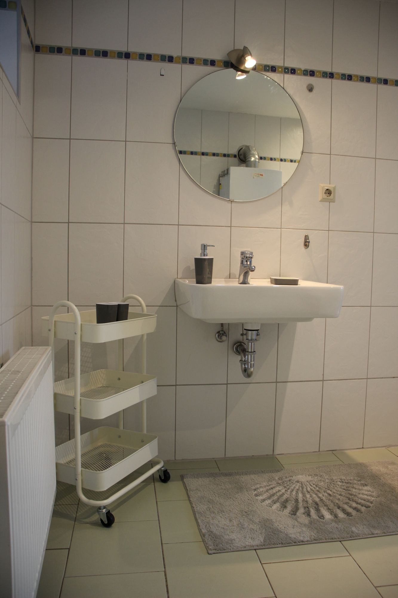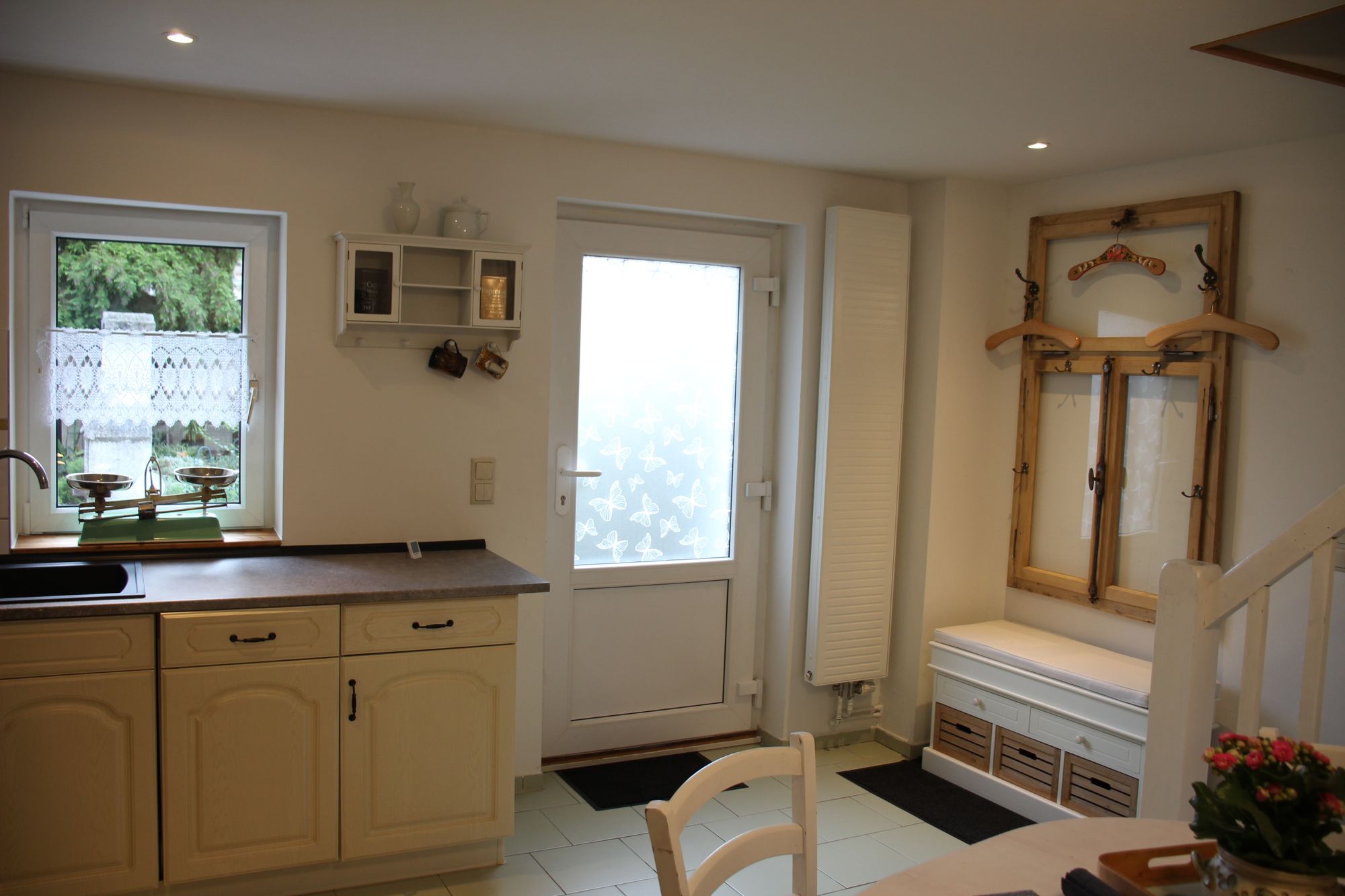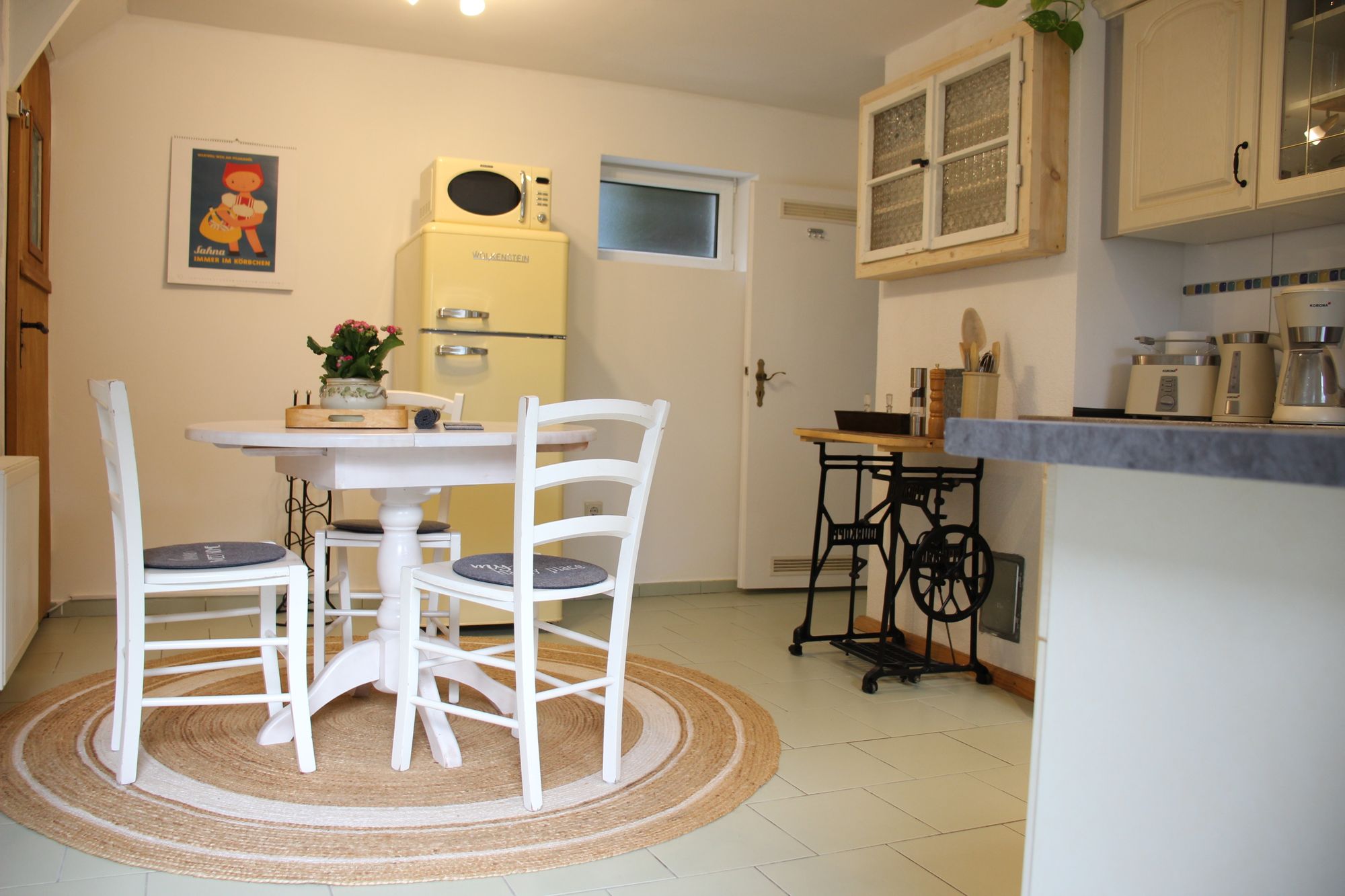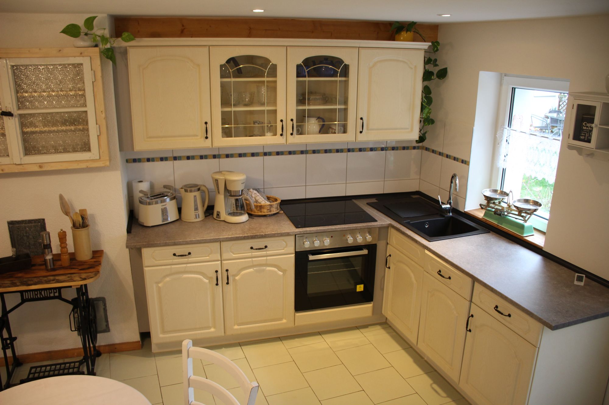 Ausstattung: großer Kühlschrank, Tiefkühlfach, Geschirrspüler, Mikrowelle, 4-Feld-Cerankochfeld, Backofen, Spülbecken, Kaffeemaschine, Wasserkocher, Toaster und diverse Koch-Utensilien