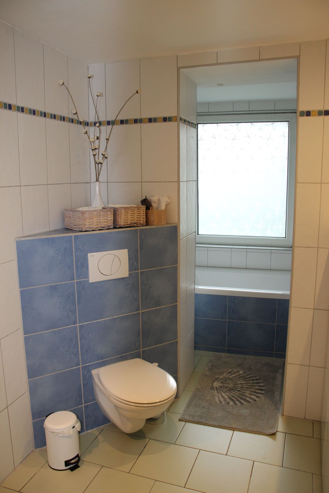 Badezimmer mit Badewanne (zwei Schrägen), Toilette, großem Fenster und Waschbecken