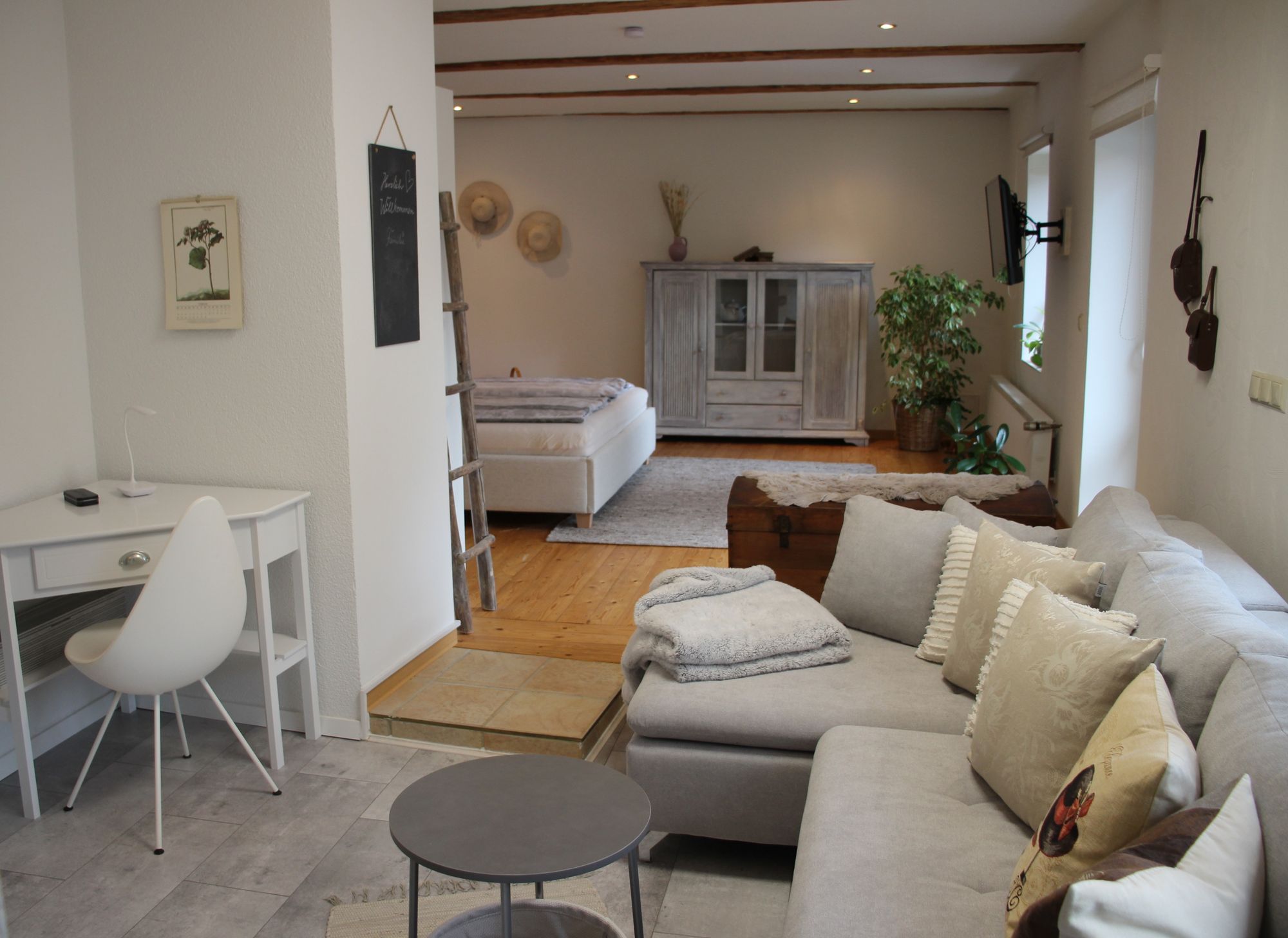 Einfach bezaubernd ist auch der Wohn- und Schlafbereich im Obergeschoss des HOFHAUSES im FACHWERK mit einer kleinen Pantryküche für den Tee am Abend. Eine gemütliche Schlafcouch, ein bequemes Doppelbett, ein kleiner Sitzbereich zum Schreiben der Ansichtskarten oder einfach zum Lesen - alles wurde für Sie mit Bedacht zusammengestellt. Das Licht ist dimmbar und über der Couch erstrahlt ein LED-Sternenhimmel. Eine zweite Toilette erspart Ihnen in der Nacht den Weg nach unten.