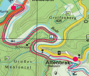 Den Bodeweg nach Wendefurth erreichen wir über die untere oder auch über die obere Bodebrücke in Altenbrak, von wo aus wir dem Wanderweg ("blaues Dreieck") im Bodetal bis nach Wendefurth folgen. Wir überqueren die B81 und gehen die, auf der gegenüberliegenden Seite einmündende Strasse bis zur Dammkrone der Talsperre Wendefurth.