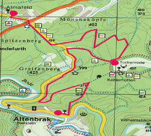 Auf ausgeschilderten Wegen erreichen wir die Möncheköpfe (402 m ü.NHN) und weiterführend den Waldrand. Dort treffen wir auf die Straße Altenbrak - Hüttenrode, auf der wir dann über die Kreuzung (B 81) hinweg, zum Ferienhotel Almsfeld gelangen. Den Rückweg können wir mit einem öffentlichen Bus antreten (siehe INSA-Fahrplanauskunft).