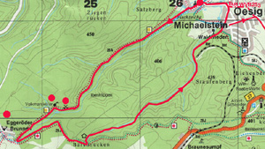 Es geht vorbei am Volkmarskeller (Grundsteinmauerreste mit Texttafel), weiter talaufwärts, vorüber am Mittelberg (altes Bergbaugebiet) bis wir den Eggeröder Brunnen erreichen - eine kleine Siedlung mitten im Wald. Am Ortseingang der Siedlung biegen wir nach links in Richtung Blankenburg ab. Auf dem Herzogsweg wandern wir zu einer Schutzhütte und schwenken nach links in den Silberbornsgrund - einem wildromantischen Tal -, wo wir die Siedlung Oesig am Talausgang erreichen. Von hier können wir mit dem Bus nach Blankenburg zurückkehren.