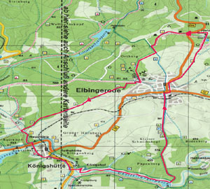 Im Steinbachtal treffen wir auf einen Rastplatz mit Schutzhütte. Von dieser Hütte in südlicher Richtung verläuft unser Wanderweg (gelber Kreis). Wir folgen ihm nach Neue Hütte, Königshütte in südlicher Richtung. Ab Königshütte laufen wir in östlicher Richtung am Nordufer der Überleitungssperre entlang bis zur Staumauer. Hier biegen wir nordwärts ab in Richtung Elbingerode. Vor Elbingerode - an einem Kalksteintagebau - ist ein Infopunkt zur Bergbaugeschichte und der Kalkindustrie im Bodfeld. Über Elbingerode, Galgenberg, Drei Eichen und Hartenberg gelangen wir wieder zurück zu unserem Ausgangspunkt - dem Schaubergwerk Büchenberg.