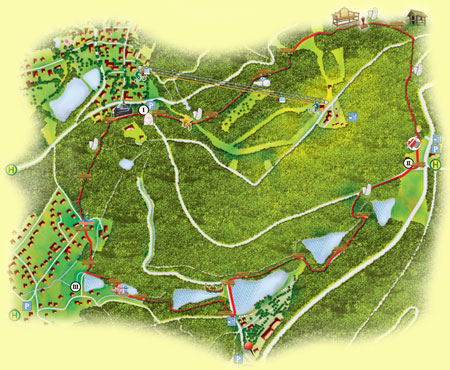 Der Wanderweg verläuft bei bequemer Steigung weiter auf den Bocksberg hinauf, wo Sie eine der drei Einkehrmöglichkeiten am Wanderweg, die Bocksberghütte, finden. Weiter geht es vorbei am Auerhahn mit angeschlossenem Restaurant und den Teichen des Oberharzer Wasserregals, wo Sie am Grumbacher Teich zu einer weiteren Einkehrmöglichkeit, dem Cafe Egerland, gelangen.