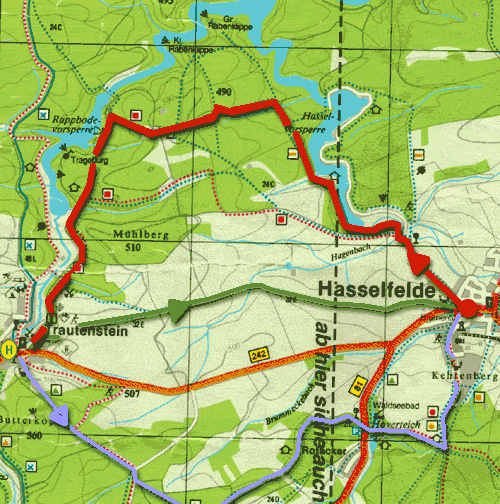 Start ist die Tourist-Information in Hasselfelde. Weiter über Hagenmühle auf dem "Weg der Deutschen Kaiser und Könige im Mittelalter" (Krone als Wegezeichen) bis zur Staumauer der Rappbodevorsperre. Von hier aus wandern wir auf dem Weg links an der Talsperre entlang (Wegemarkierung "roter Kreis") bis nach Trautenstein hinein. In Trautenstein, nahe dem Hotel "Druidenstein", bzw. der Kirche, befindet sich die Haltestelle, von wo aus wir mit dem Bus zurückfahren können.