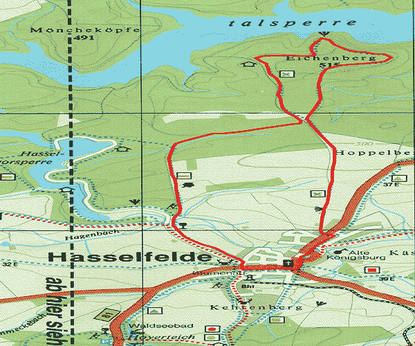Hier beginnt der Rundwanderweg durch das NSG "Eichenberge". Besondere Aufmerksamkeit gilt den seltenen Pflanzen, wie z.B. dem Seidelbast, dem Märzenbecher, der Akelei oder der Türkenbundlilie. Außerdem bietet sich ein einmaliger Blick auf den Stausee der Rappbodetalsperre. Der Rundwanderweg führt uns wieder an die einsame Buche. Von hier aus gehen wir ca. 1 km zurück und biegen rechts in das Statal ein. Nach ca. 1 km stoßen wir auf einen kleinen Teich. Hier halten wir uns links und erreichen bergauf den Hüttenberg. Von hier aus sehen wir das Hasseltal mit Hasselfelde vor uns liegen. Im Tal angelangt liegt vor uns die Hagenmühle. Wir halten uns aber links und erreichen über einen Wiesenweg wieder unseren Ausgangspunkt Hasselfelde.