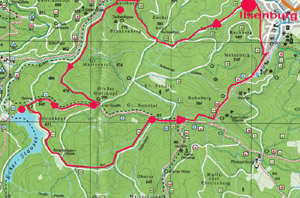 Wir folgen dem Weg und erreichen die Würtenberger Bank. Nun kreuzen wir den Kolonnenweg und wandern in den Hochwald bis zur Taubenklippe. Um den Frankenberg herum kommen wir wieder auf den Kolonnenweg, dem wir über die Ernstburg und das Kruzifix bis hin zum Dielenweg folgen. Wir gelangen über die Spinne zur Eckertalsperre. Von hier führt der Weg zum Scharfenstein (Rangerstation). Wir folgen der Fahrstraße, die dann links in das Tiefenbeekstal führt. Durch das Große Sandtal gelangen wir dann wieder in das Ilsetal und erreichen entlang der Ilse unseren Ausgangspunkt.