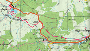 Unser Weg führt zunächst durch einen Fichtenwald (ca. 2 km), bevor er als Wiesenweg auf den Ort Güntersberge trifft. Von Güntersberge aus können wir mit der Selketalbahn nach Stiege zurück fahren.
