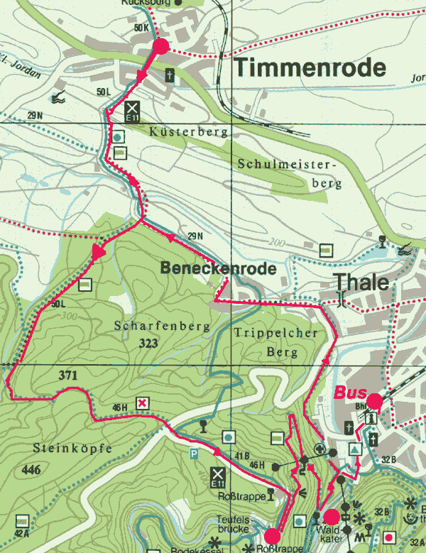 Weiter geht es in Richtung Thale. Wir passieren die Talstation von Schwebebahn und Sessellift und gehen rechts über die Bodebrücke zum Busbahnhof. Wanderer, die zurückwandern möchten, orientieren sich in Richtung Benneckenrode, einem Ortsteil von Thale. In Richtung Timmenrode über Eggerode erreichen wir den Ausgangspunkt.