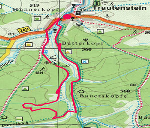 Von der Sparkasse, unserem ersten Orientierungspunkt, gehen wir über die Bode und wandern in das idyllisch gelegene Dammbachtal. Nach ca.1,5 km erreichen wir eine Schutzhütte und der Weg führt weiter - über eine Holzbrücke - über den Dammbach. Auf der anderen Seite des Baches wandern wir durch den Hochwald nach Trautenstein zurück.