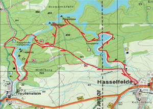 Die Wanderung beginnt an der Kurverwaltung in Hasselfelde. Wir bewegen uns in Richtung Neue Schule und erreichen nach ca. 1 km die Hagenmühle. Hier überschreiten wir das Hasseltal und wandern nach links die Forststraße entlang, wo wir nach wenigen 100 m den Stausee der Hasselvorsperre erblicken. Wir gehen immer am Ufer entlang und erreichen die Staumauer, die wir überqueren. Nach 300 m erreichen wir eine Forststraße, der wir in rechter Richtung und bergab folgen. Nach 300 m ist die Talsohle erreicht und wir steigen den ausgewiesenen Weg zu den Rabensteinen bergan. Unterwegs bieten sich schöne Ausblicke auf die Rappbodevorsperre und in das Hasseltal. Vom großen Rabenstein, als auch vom kleinen Rabenstein, können wir in das Tal der Rappbodevorsperre schauen.