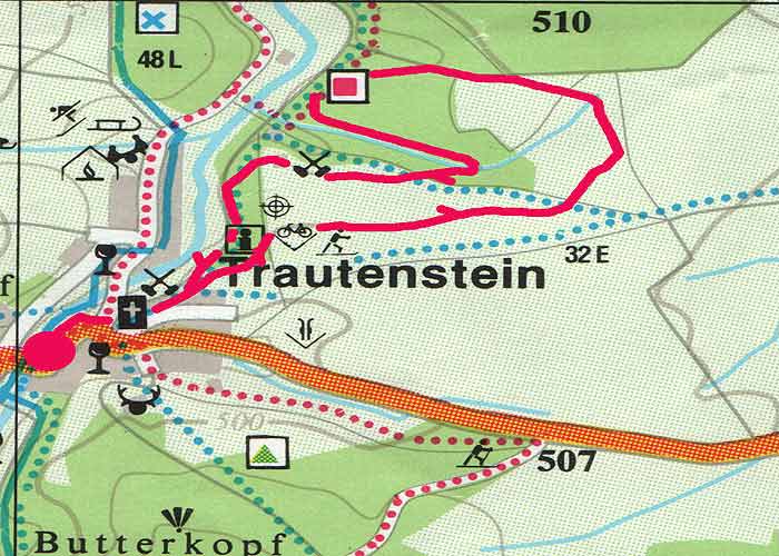 Ausgangspunkt ist der Druidenstein, ein Hotel in der Mitte des Ortes, unmittelbar an der B242. Von hier aus gehen wir an der Kirche vorbei. Der höher gelegene Glockenturm steht neben der Kirche, ebenso wie der Druidenstein, eine alte Kultstätte der Kelten, von denen wohl auch der Name des Ortes hergeleitet ist.