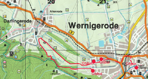 Wir fahren mit der Citylinie 3 ab Forum "Bunte Stadt" bis zur Haltestelle "Schwimmhalle" oder "Am Ziegenberg". Ab der jeweiligen Haltestelle, laufen wir an der Weinbergstraße stadtauswärts. Nach ca. 500 m veläuft die Straße in einer scharfen Linkskurve und vor uns verläuft im Scheitel der Kurve ein Feldweg durch Gärten, leicht bergan steigend. Hier wandern wir weiter geradeaus, über ausgedehnte Wiesenflächen, hinauf zur langen Hecke, die uns rechter Hand, bis fast an den Ortsrand von Darlingerode begleitet. Zurückschauend haben wir einen wunderschönen Blick auf Wernigerode und weit in das Harzvorland hinein.